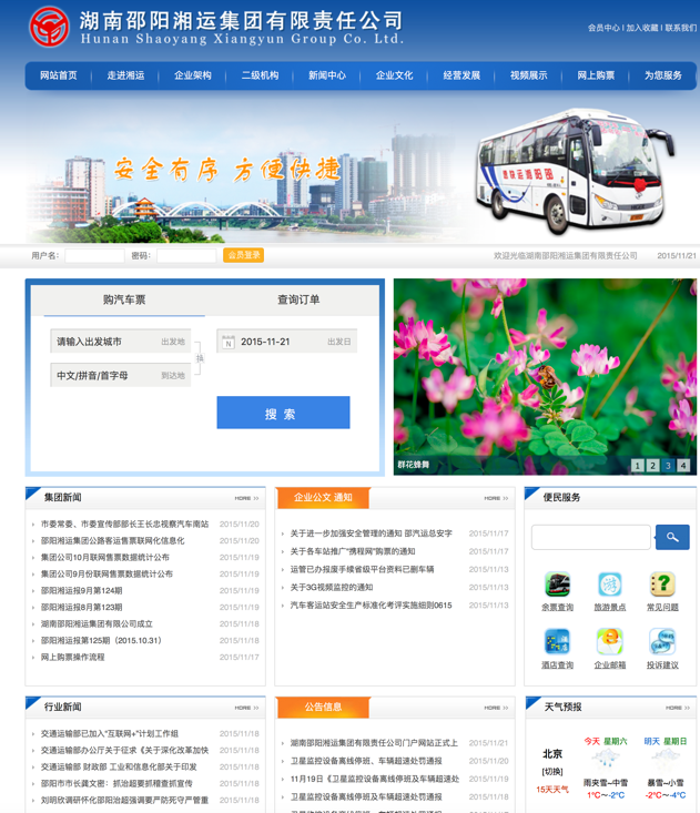 為加強(qiáng)企業(yè)信息化工作,利用網(wǎng)站推廣企業(yè)文化、提升內(nèi)部管理效率,湖南邵陽(yáng)湘運(yùn)集團(tuán)有限責(zé)任公司官方網(wǎng)站域名m.rcfleet.com于11月11日通過(guò)審核,網(wǎng)站次日正式上線發(fā)布。集團(tuán)公司與旗下客運(yùn)子公司均有獨(dú)立版面,可發(fā)布文件信息、動(dòng)態(tài)新聞等,今后集團(tuán)公司的公文、通知等將在網(wǎng)上發(fā)布,各子公司在網(wǎng)上查看下載,極大提升了文件發(fā)布的效率。該網(wǎng)站最大的特點(diǎn)是可以查詢邵陽(yáng)地區(qū)一二級(jí)車站所有車輛班次、時(shí)間、價(jià)格信息,并可在線購(gòu)票,購(gòu)票成功后憑密碼或身份證前往車站自動(dòng)取票機(jī)(或人工售票窗口)取票,該網(wǎng)站為旅客提供了一個(gè)便捷的購(gòu)票渠道。
