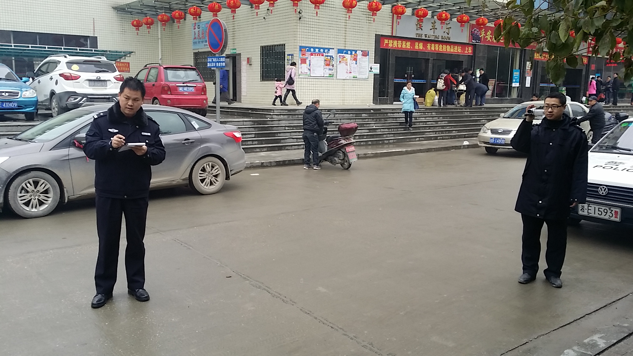 圖為湘運集團洞口客運分公司稽查保衛(wèi)科工作人員配合交警部門對亂停亂擺車輛進(jìn)行抄牌錄像。